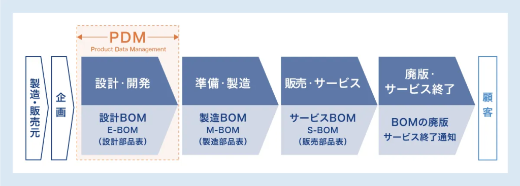 - PDM(製品情報管理)とは、CADデータやE-BOMなど設計・開発段階の情報を一元管理するシステムである