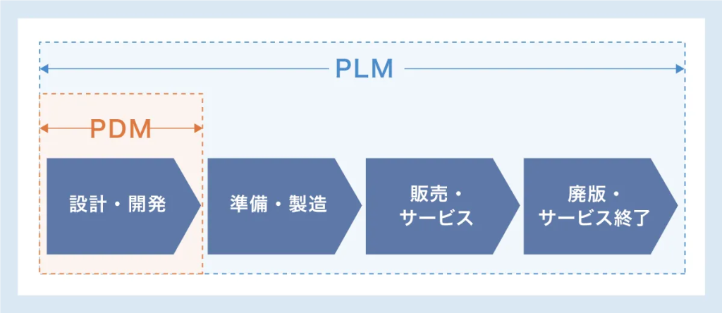 PLMと似た概念として「PDM(Product Data Management)」がありますが、両者は管理範囲が異なります。